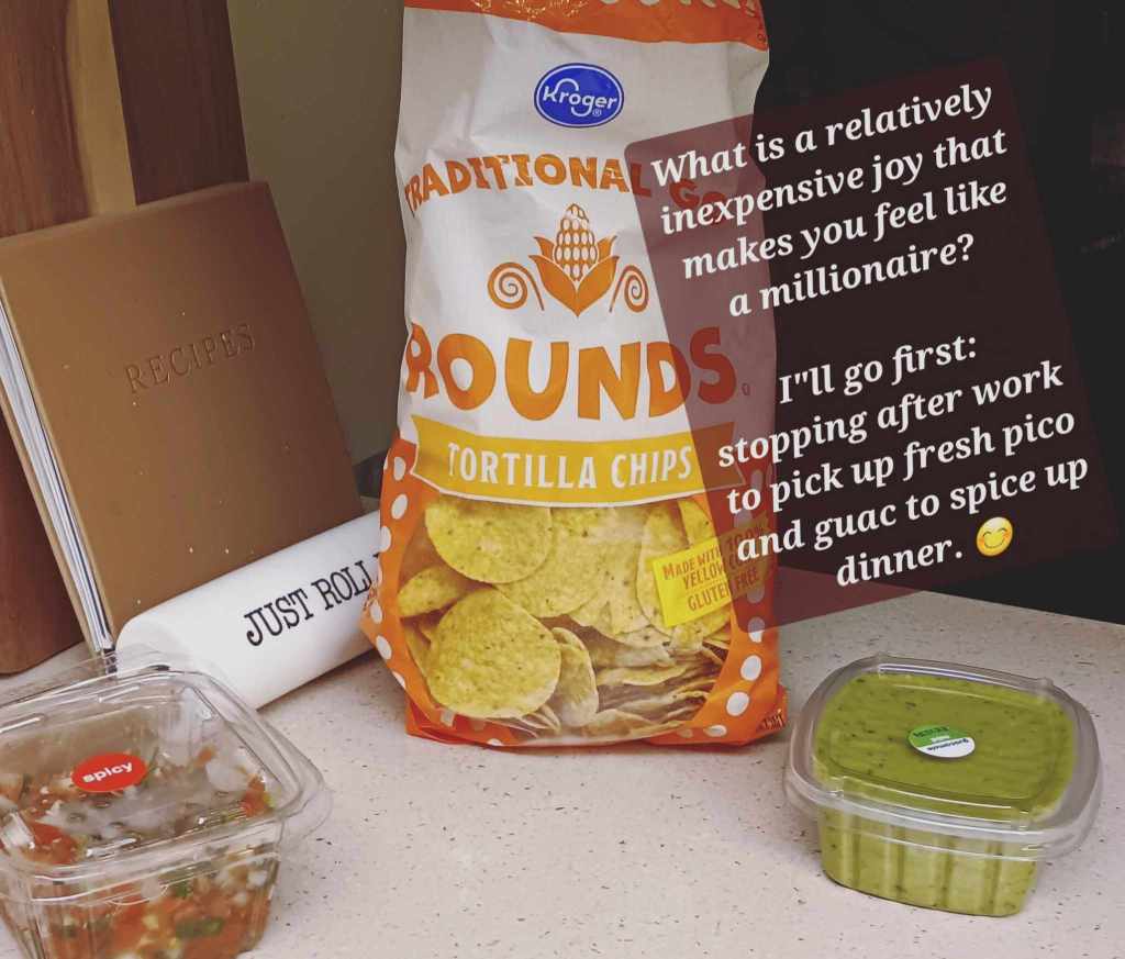 In the initial big haul, I stock up on things like tortillas, cream of mushroom soup, pasta, pasta sauce, Zatarain’s, beans, frozen vegetables, frozen potatoes and frozen plant-based “meatless” products, etc.- all the things that won’t go bad, but are also affordable. This stock up helps fight feelings of food scarcity that could come up as the month goes on and the budget dwindles. I always feel secure that I have pasta, beans and rice I can whip up in a pinch.